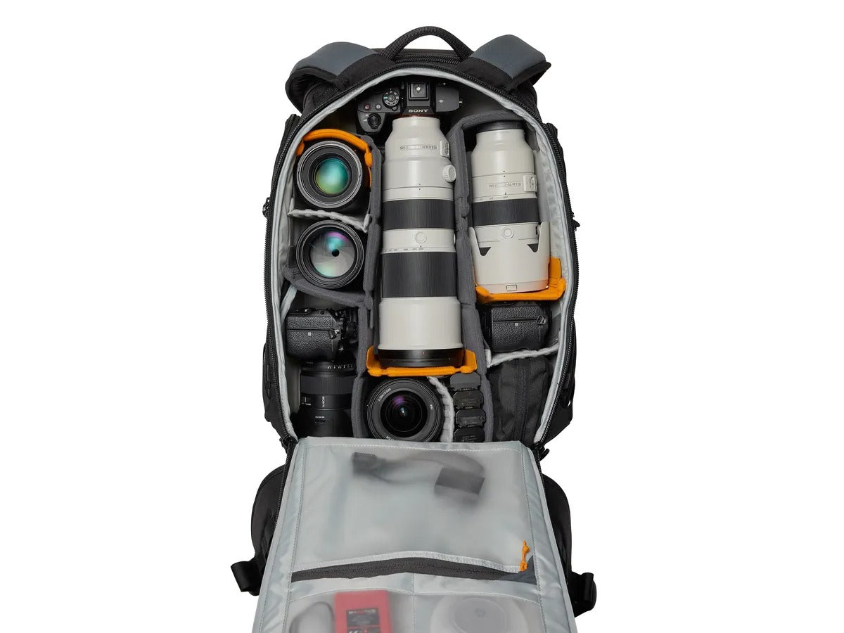 Le Lowepro ProTactic BP 450 AW III est un sac à dos photo robuste et modulaire, conçu pour accueillir un kit complet : boîtier reflex ou hybride, plusieurs objectifs, accessoires, et même un ordinateur portable. Il offre un accès au matériel depuis quatre points (sides, dessus, dos) pour un usage flexible, ainsi que de nombreuses poches et fixations extérieures pour trépied, bouteille ou accessoires.