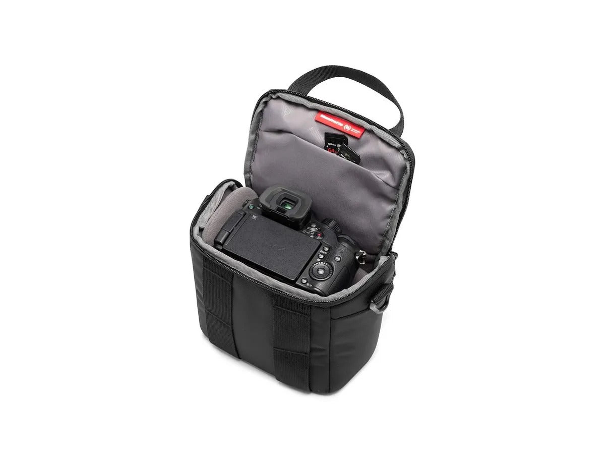 Le sac Manfrotto Advanced Shoulder Bag S III est conçu pour accueillir un appareil hybride ou reflex + un objectif supplémentaire, avec de l’espace pour quelques accessoires (batterie, cartes mémoire, petits objets). Il dispose de parois rembourrées, de séparateurs internes ajustables, d’une poche intérieure pour accessoires, et d’un strap frontal permettant de fixer un petit trépied.